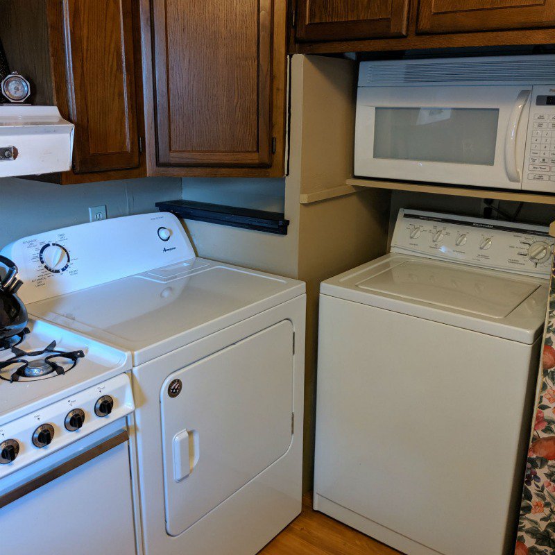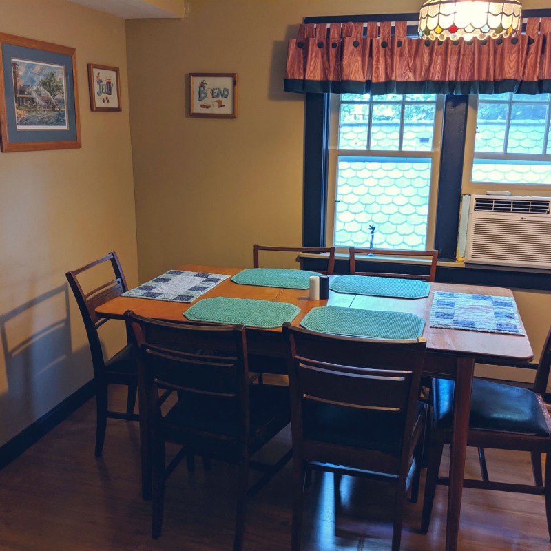 The kitchen has a maple dining room set with buffet, dishwasher, washer and dryer, and multiple appliances (blender, coffee maker, toaster, toaster oven). This apartment is a favorite of many returning families. Wifi is included.