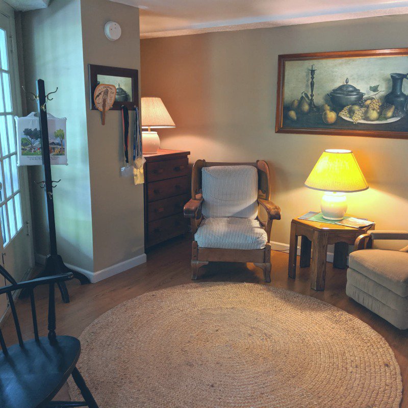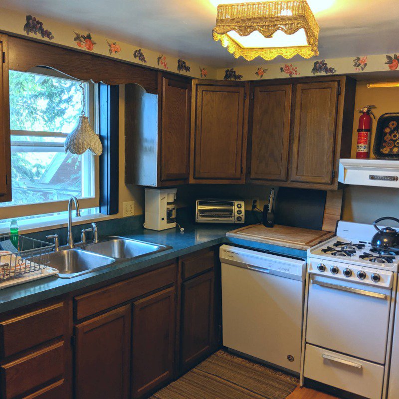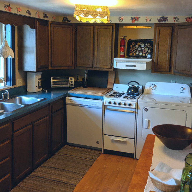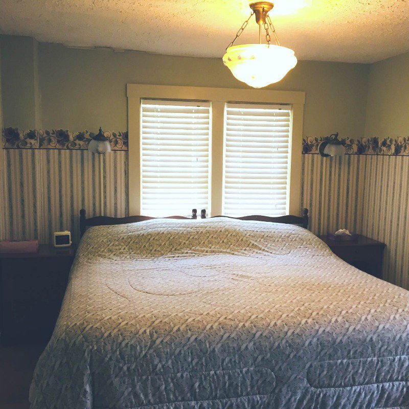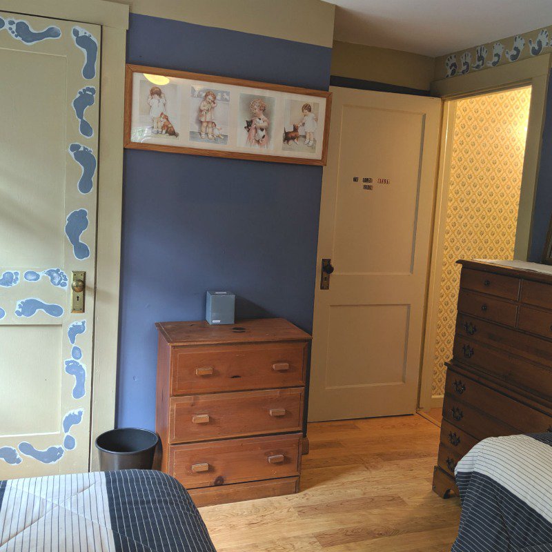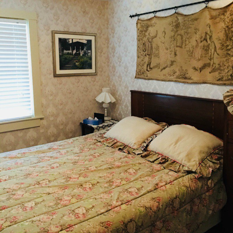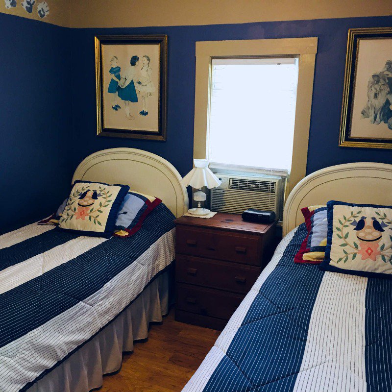 The living room has a large couch and two stuffed chairs and a rocker, and a ceiling fan. There is a window AC in the bedrooms and kitchen. The master bedroom has a king bed and ensuite bathroom with tub/shower unit. The queen bedroom has a queen bed and its bathroom has tub/shower, toilet and sink. The third bedroom (called “Ye Olde Messy Room” by its former child inhabitants) has two twin beds.