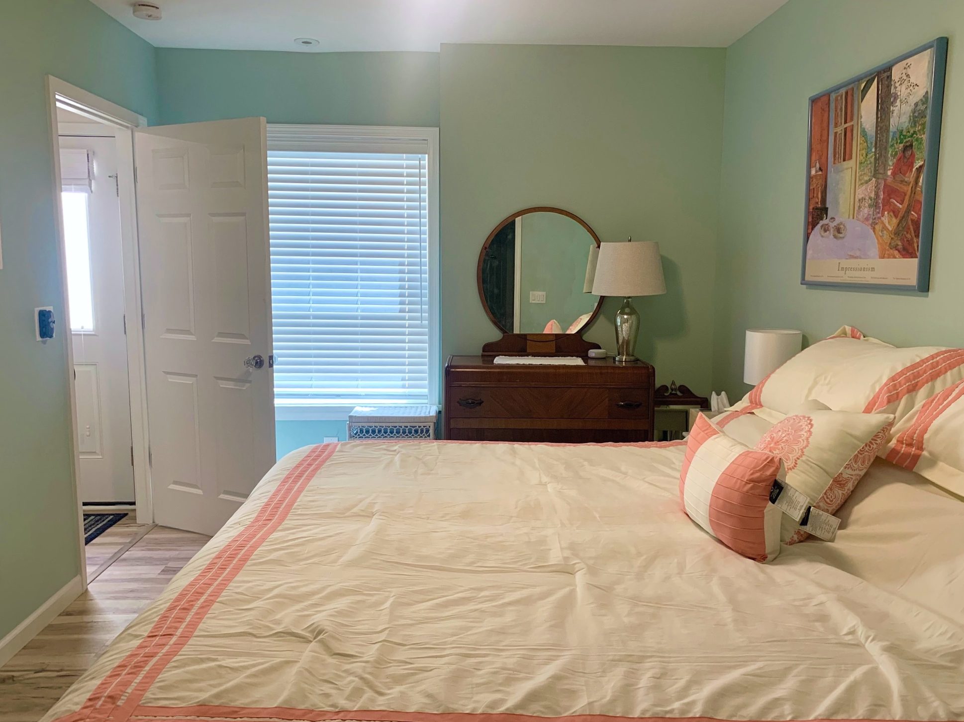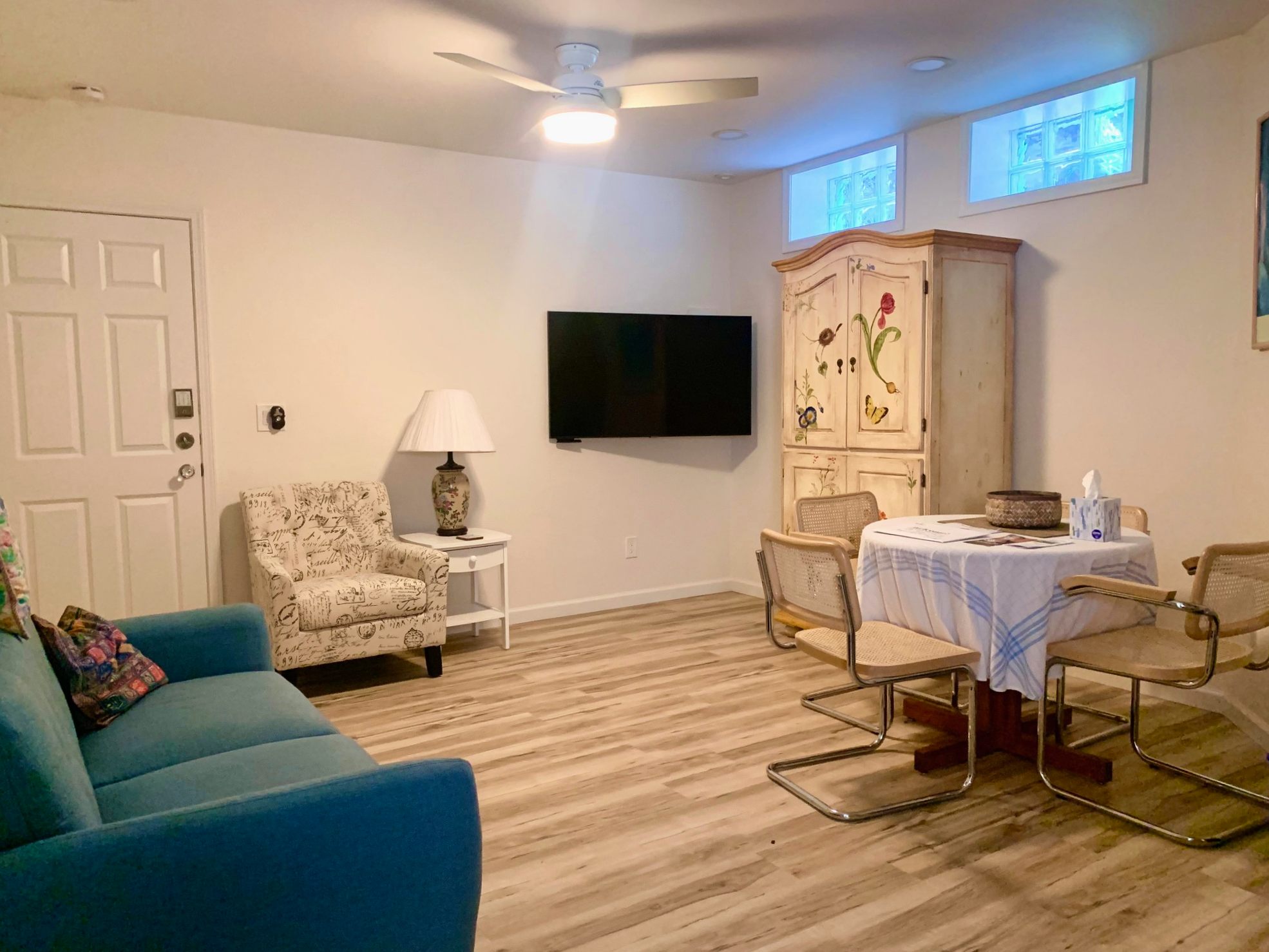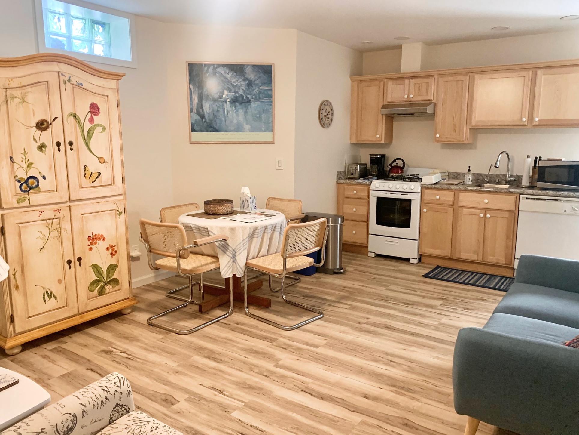 Total Renovation 2020! Private entrance for high ceilinged one bedroom unit with full kitchen and living area. Bedroom with large lighted closet has king or twin beds. Bathroom has walk-in shower and double sink vanity with medicine chest. Full central air with ceiling fans in LR and Bedroom. Access to laundry room and slop sink by appointment. Small herb garden. Patio with table & 4 chairs at entry level. No smoking. Well located in Historic District, 538 feet from the Amp and close to HOP. Pet friendly for one small (under 40 lbs.) hypoallergenic non-shedding dog (add a $200 cleaning deposit for dog). Fully furnished. Parking may be available.