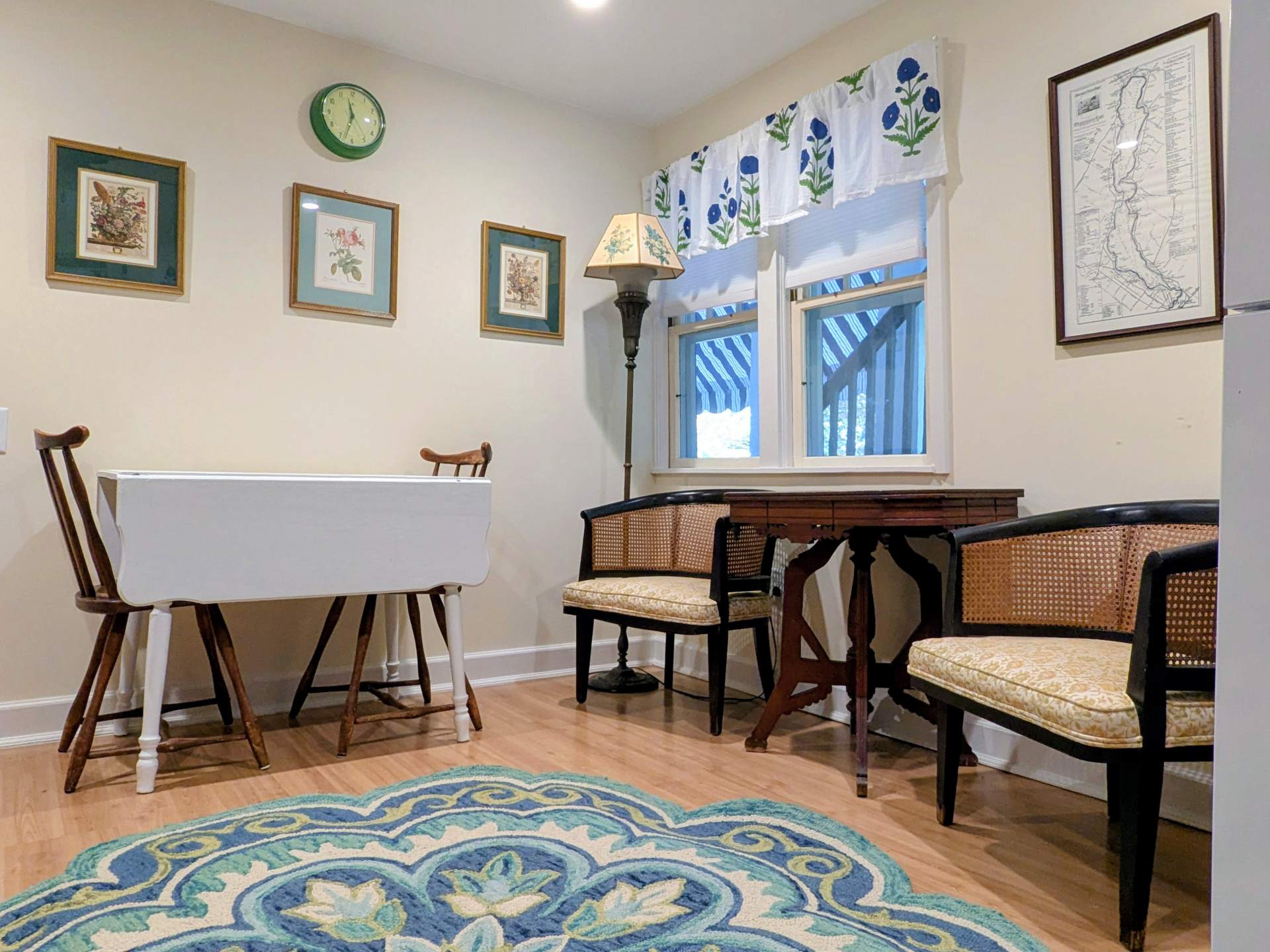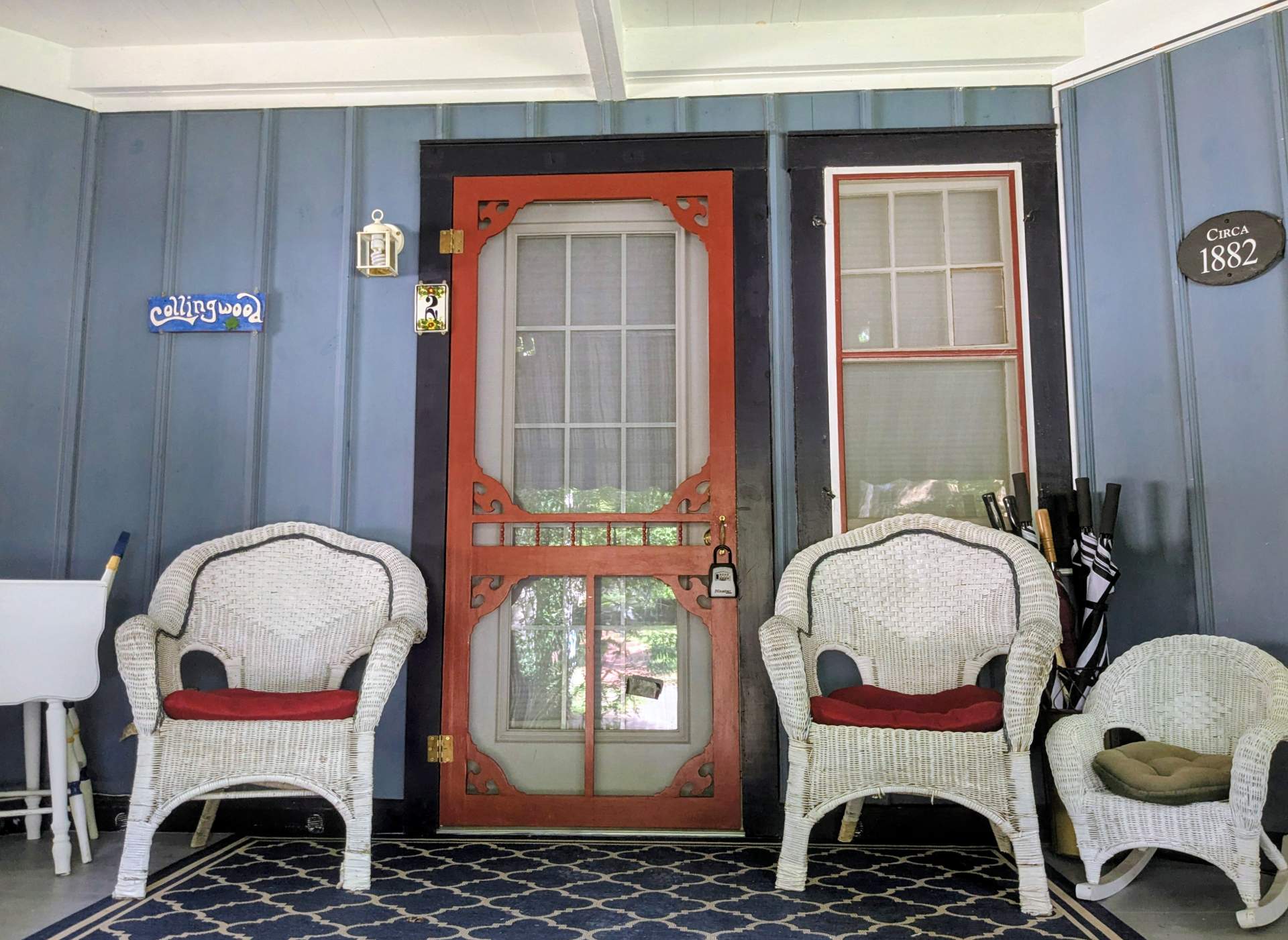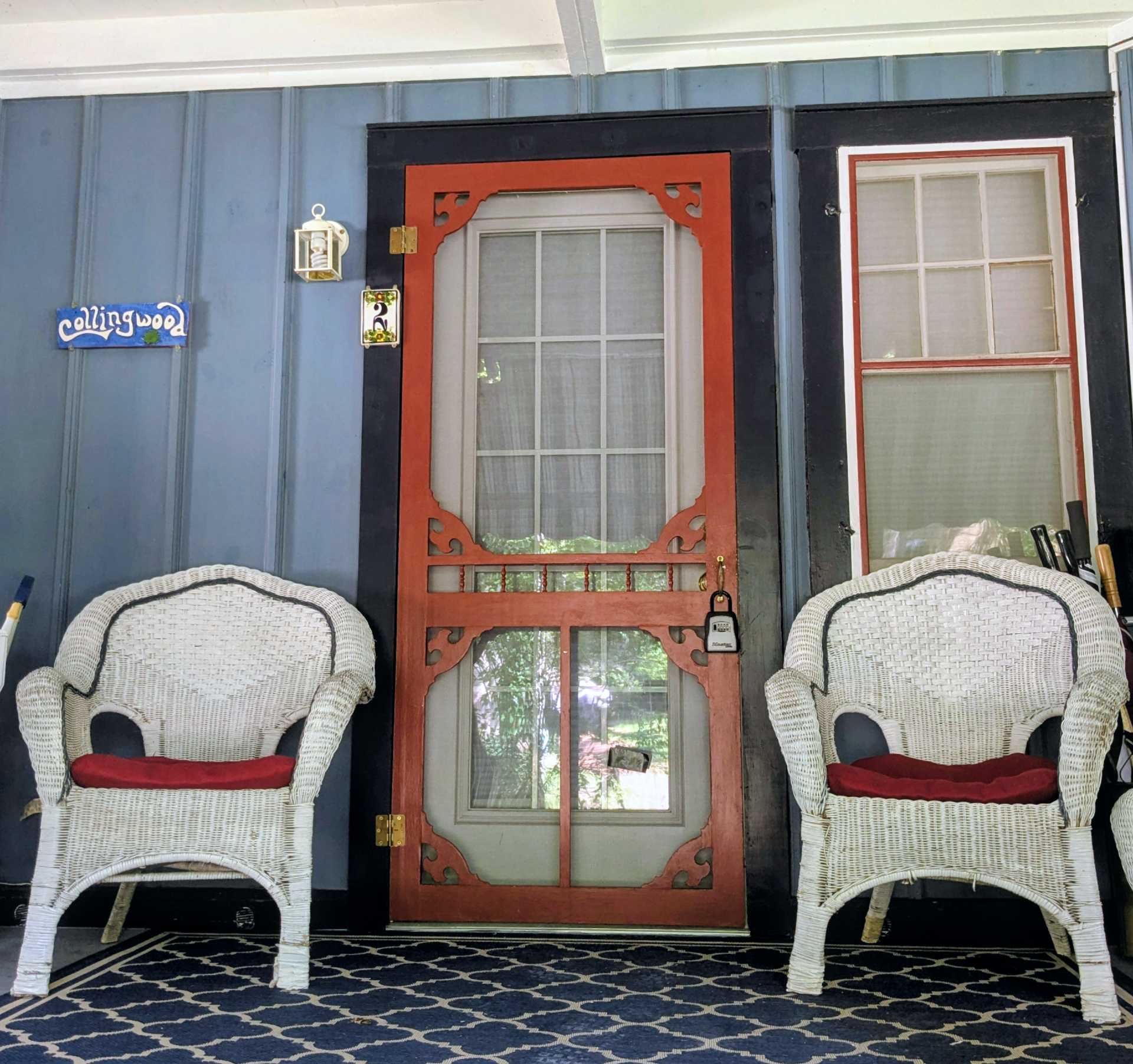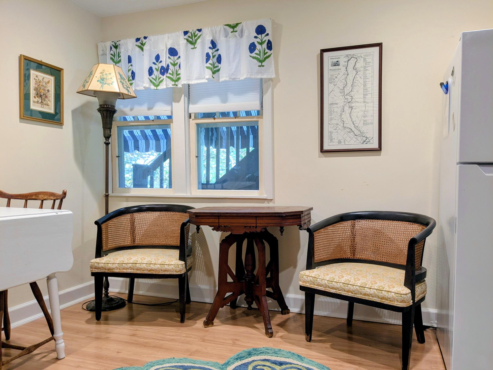 The porch area has two rocking chairs, a wooden dinging table, and chairs. There is heating and AC. This apartment is the favorite of many who enjoy its antique charm and easy access. Wi-Fi is included, and laundry is available on the premises.