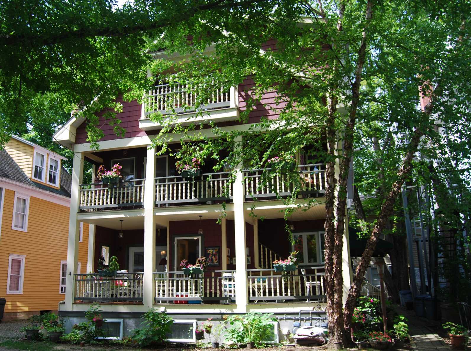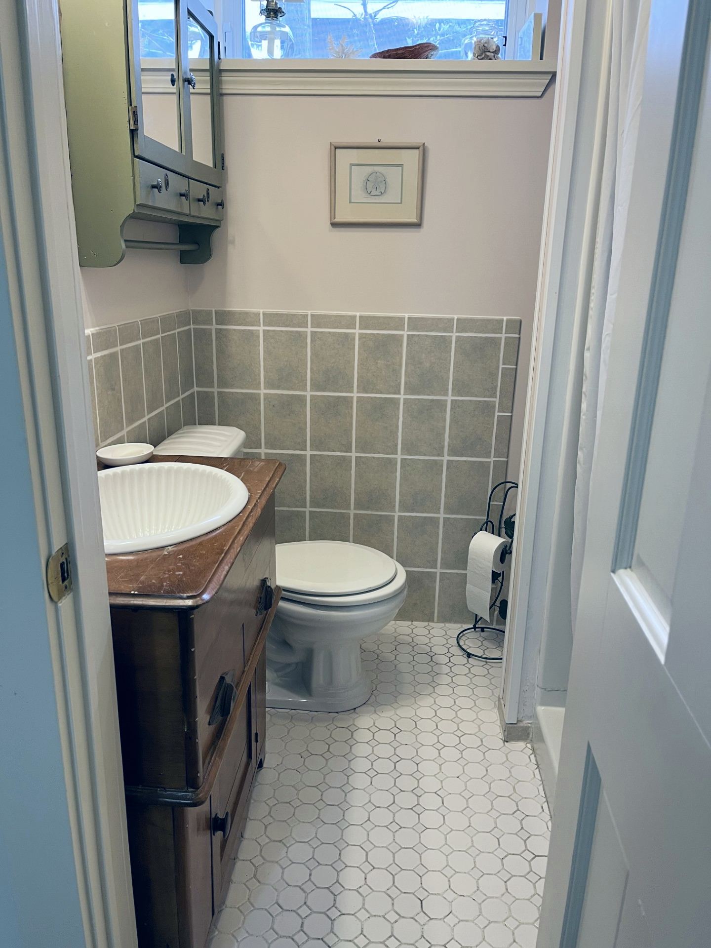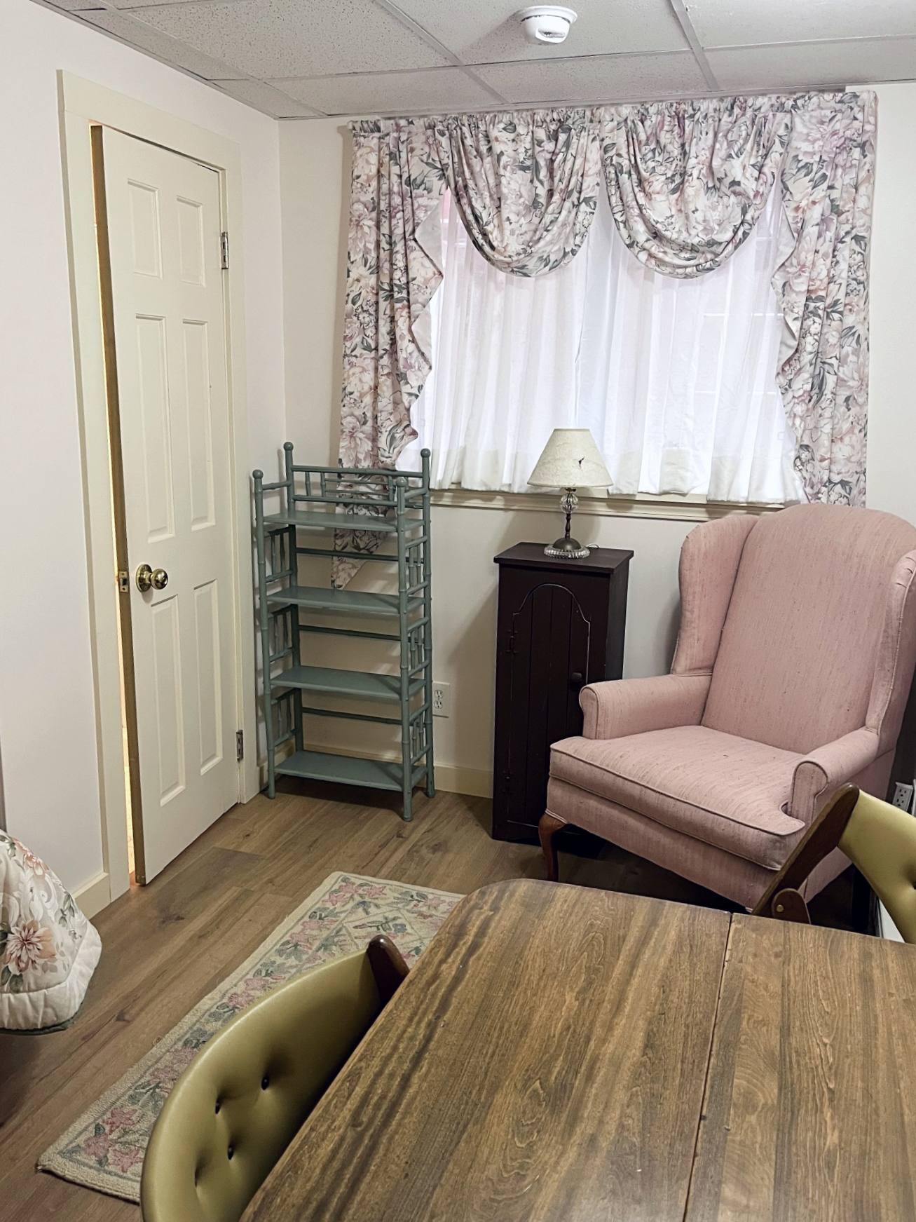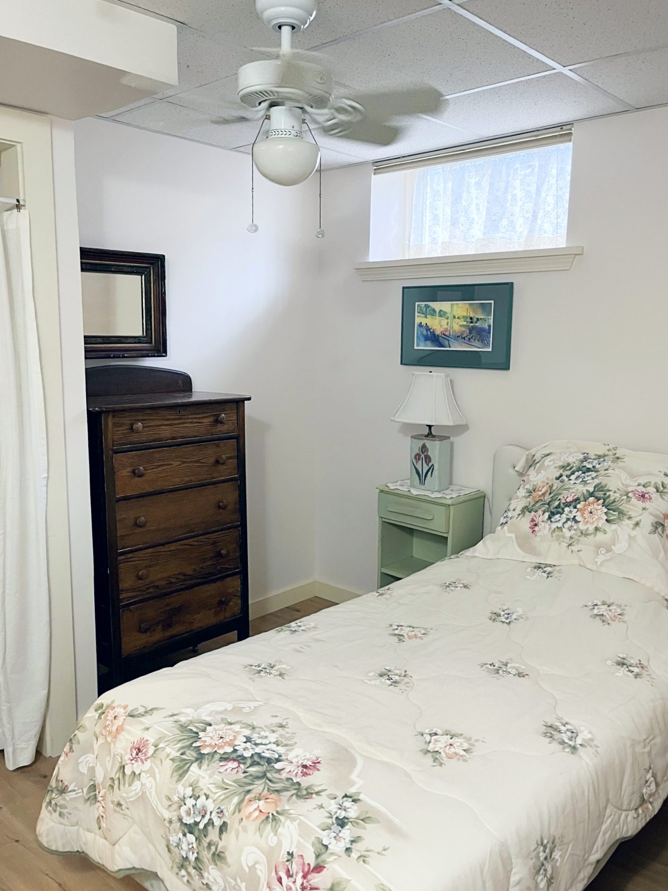 Studio apartment with a 3/4 flight of steps down to the unit. The apartment has a double bed, Wi-Fi, a full kitchen, a ceramic tile bathroom with a shower, and a ceiling fan.