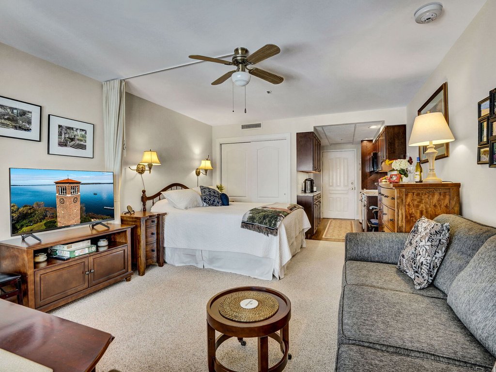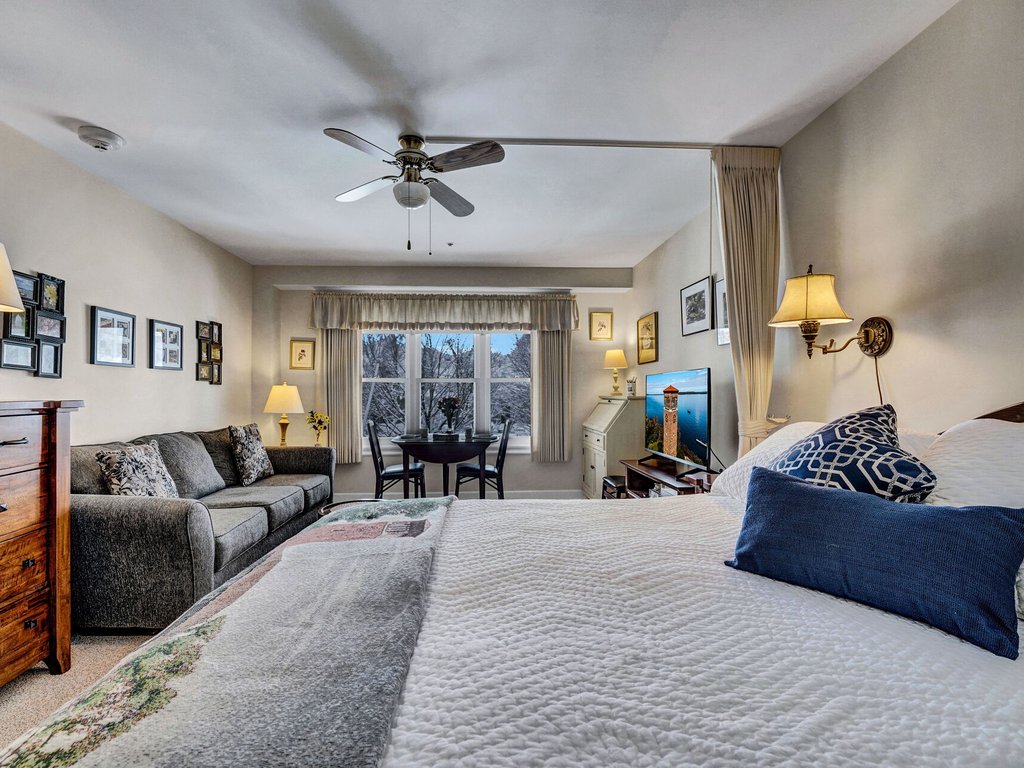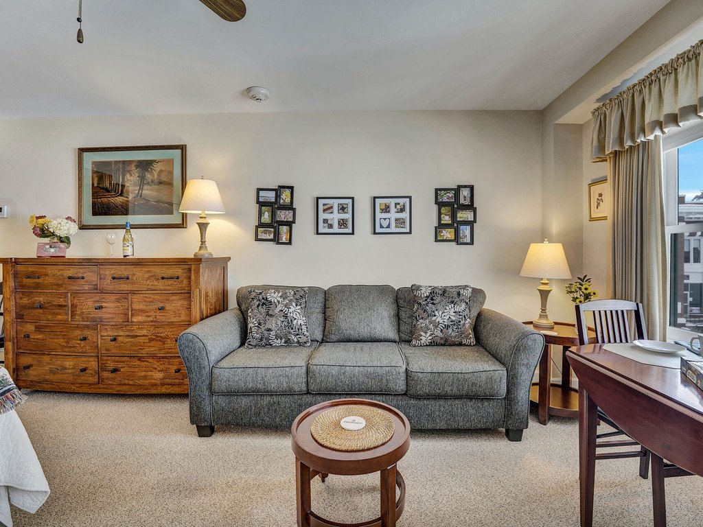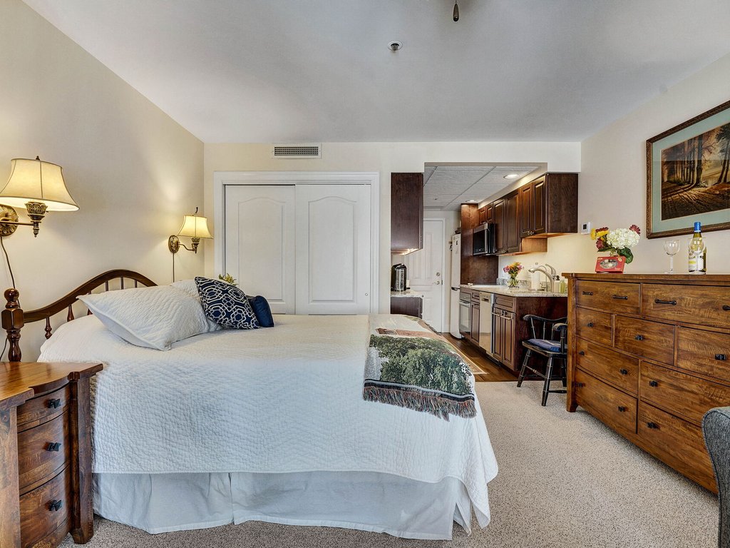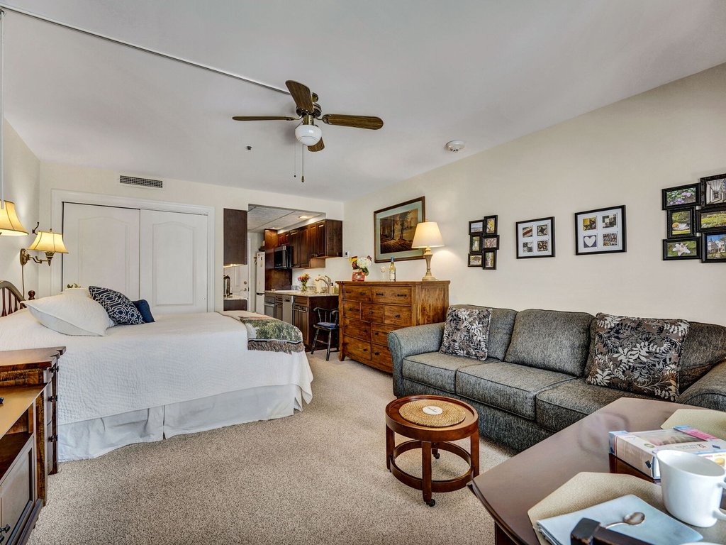 Enjoy front row views of Bestor Plaza in this newly updated 2nd floor efficiency condo(elevator in the building). Airy, private and entertaining all at once. Central air-conditioning, laundry down the hall, shops and the spa down the elevator, and all Chautauqua has to offer just out the front door. The fully equipped kitchen includes a reverse osmosis spigot at the the kitchen sink for drinking water and a Nespresso pod coffee maker. Queen size bed, WIFI, and a soaking tub complete this package. The St. Elmo also has a large lobby and covered front porches to enjoy as well. A parking space in the South Lot is an added bonus! $2500/week, $150 cleaning fee.
